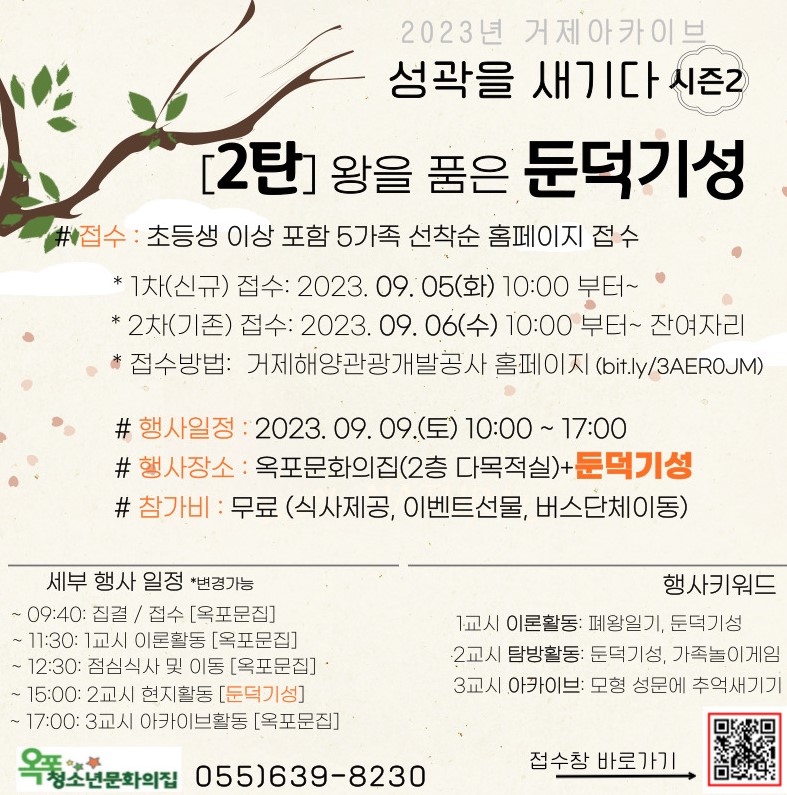 거제해양관광개발공사 옥포청소년문화의집에서는 가족화합과 더불어 지역사회가치의 성장 확대를 위해 운영하는 2023년 거제아카이브 2차『왕을 품은 둔덕기성』행사를 진행한다고 하여 아래와 같이 안내드립니다. 가. 행 사 명: 2차 거제아카이브왕을 품은 둔덕기성 나. 행사일정 및 대상: 홈페이지 접수 ① 1차(신규)접수:2023. 09. 05.(화), 10:00~ 초등이상 포함 5가족 선착순 ※ 접속방법: 거제해양관관개발공사→체육?청소년→청소년문화의집→프로그램→프로그램 참가접수 ② 2차(기존)접수:2023. 09. 06.(수), 10:00~ 1차 접수후 잔여자리 선착순 ③ 활동일시:2023. 09. 09.(토), 10:00 ~ 17:00 다. 참 가 비: 무료 (중식제공) 라. 행사내용 - [이론활동]: 의종의 폐왕일기, 지명과 구조로 보는 둔덕기성 바로알기 - [탐방활동]: 둔덕기성 현장활동 및 가족놀이활동 등 추억쌓기 활동 - [아카이브]: 모형 성문에 가족추억 새기기 등 마. 기타문의: 청소년지도사 김동완 (055-639-8230)